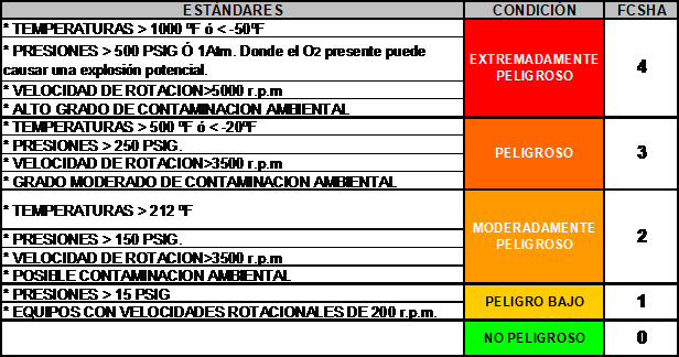 Los criterios para definir los niveles del Factor de Criticidad de Proceso (FCP), usados para el cálculo del Índice de Criticidad de Proceso (ICP), se muestran en la siguiente tabla: