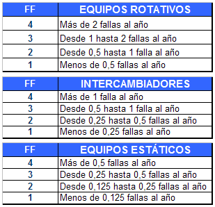 Una vez estimada la frecuencia de fallas, de acuerdo con la familia a la que pertenece el activo, se le adjudica un factor de frecuencia (FF) tal y como muestra la siguiente figura: