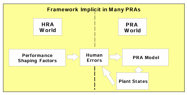 La falta de datos sobre el desempeño humano en eventos poco frecuentes, pero de alto impacto, como los accidentes en plantas nucleares, ha llevado a que el HRA utilice métodos de juicio experto para complementar la información existente. En los modelos PRA, cada nodo representa una función, sub-tarea o actividad que puede tener éxito o fallar, y el cálculo de probabilidades de fallo para los componentes técnicos se basa en ingeniería; en cambio, para las interacciones humanas se emplea el HRA.