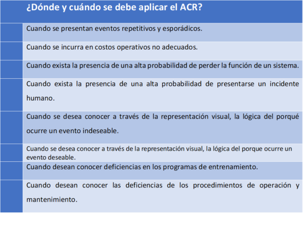 El Análisis Causa Raíz (ACR) es una metodología disciplinada de tres niveles que permite identificar de forma deductiva e inductiva las causas físicas, humanas y latentes de cualquier tipo de falla o incidente que ocurre una o varias veces, permitiendo adoptar acciones correctivas que reducen los costos del ciclo de vida útil del proceso, mejora la seguridad y la confiabilidad del negocio. El análisis permite definir la relación causal que conduce a un activo al estado de falla.